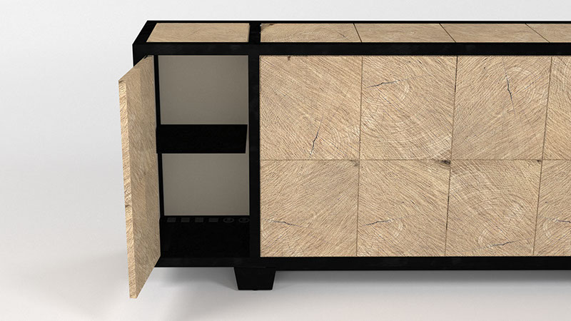 blackened steel frame, white oak butt cladding